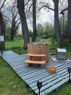Our wood fired hot tub is nestled in a grove of trees overlooking the river and is available to book.